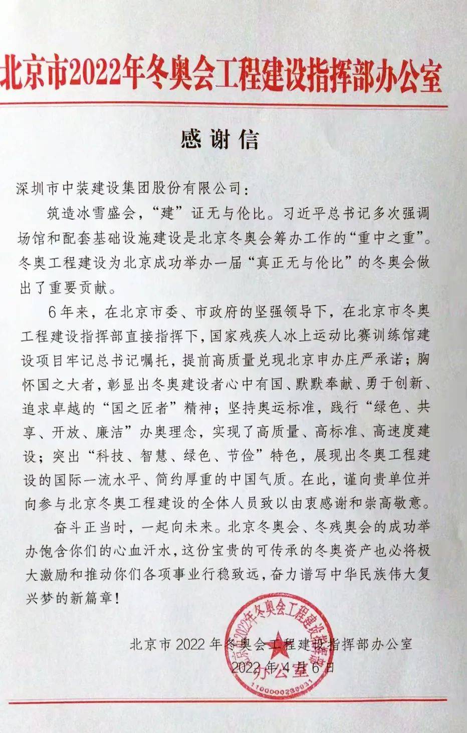 近期,中装建设收到来自北京市2022年冬奥会工程建设指挥部办公室的感谢信。信中写到中装建设在工作中“勇于创新、追求卓越的国之匠者”、“实现了高质量、高标准、高速建设”、“突出科技、智慧、绿色、节俭特色,展现出冬奥工程建设的国际一流水平”,充分肯定了中装建设服务过程中体现的专业精神和奉献精神,并对在北京2022年冬奥会、冬残奥会中为冬奥工程建设工作付出的努力致以诚挚谢意。