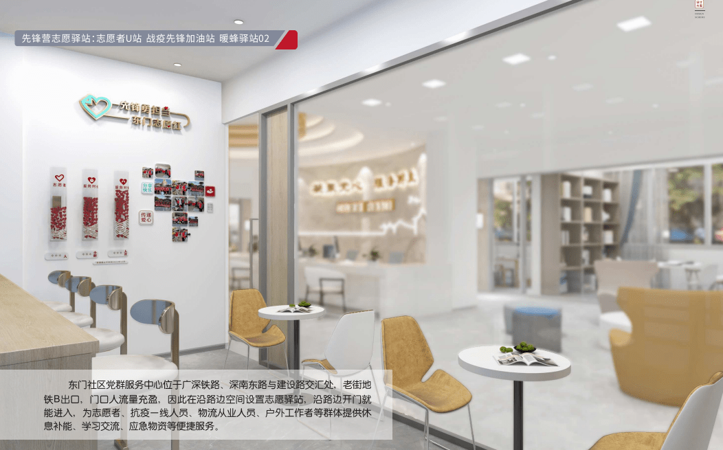东门社区党群服务中心基于东门源远流长的文化底蕴的基础上,为东门社区居民打造了一个独具风格的服务空间,集社区服务、活动沙龙、休闲洽谈、便利宣传等多种社区功能于一体,能够有效服务于社区群众的不同需求。
