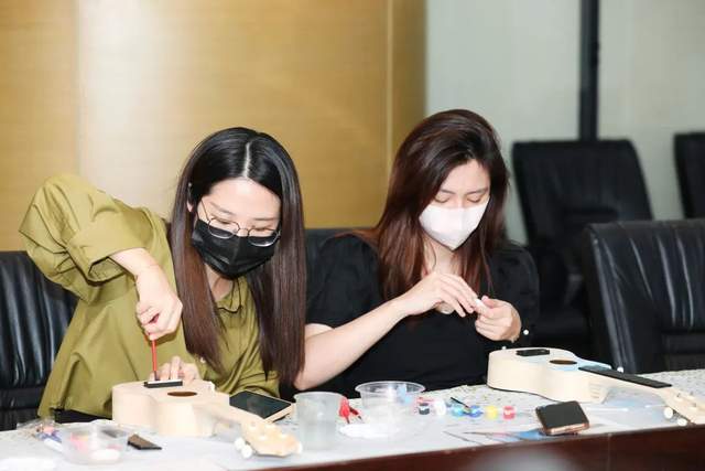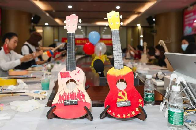 画笔在尤克里里上点缀,情感在指尖随意挥洒,创意在空气中细细弥漫,原本木色的琴身在巧手描绘中,色彩渐渐丰富起来,绘制出一件件最美的“红衣”。待颜料慢慢风干,手工老师为每一把尤克里里装上琴弦、校准。党员同志在歌唱祖国之后,亲手制作这一个个饱含深意的尤克里里,更加领悟到“盛世华章 有国有家”这句话的分量和温度。