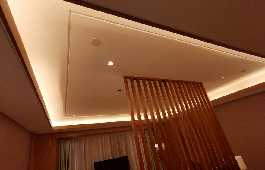 应用效果:本工程客房和酒店公共区域采用了装配式免木天花轻钢龙骨结构施工工法,天花暗光源灯槽、叠级造型创造了丰富的视觉效果,结构稳定不变形,工程竣工后,酒店运营阶段未发现质量维修问题。