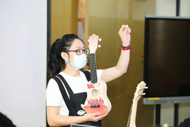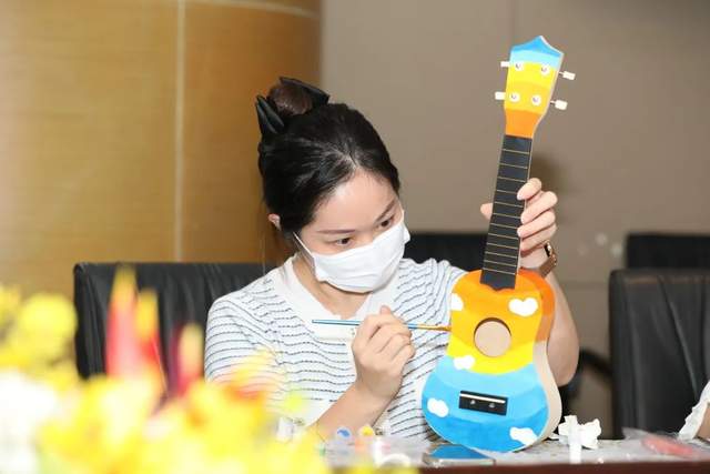画笔在尤克里里上点缀,情感在指尖随意挥洒,创意在空气中细细弥漫,原本木色的琴身在巧手描绘中,色彩渐渐丰富起来,绘制出一件件最美的“红衣”。待颜料慢慢风干,手工老师为每一把尤克里里装上琴弦、校准。党员同志在歌唱祖国之后,亲手制作这一个个饱含深意的尤克里里,更加领悟到“盛世华章 有国有家”这句话的分量和温度。